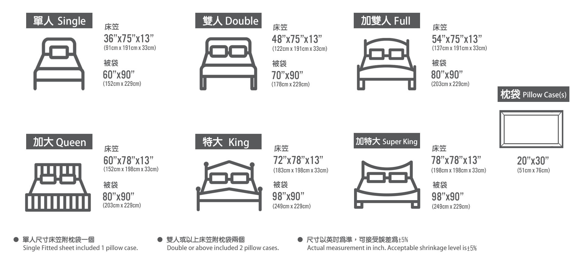 *According to International Industrial Standard: Thread Count Fitted Sheet and Pillow Case(s) 270 (±5%) per inch2, Duvet Cover 310 (±5%) per inch2