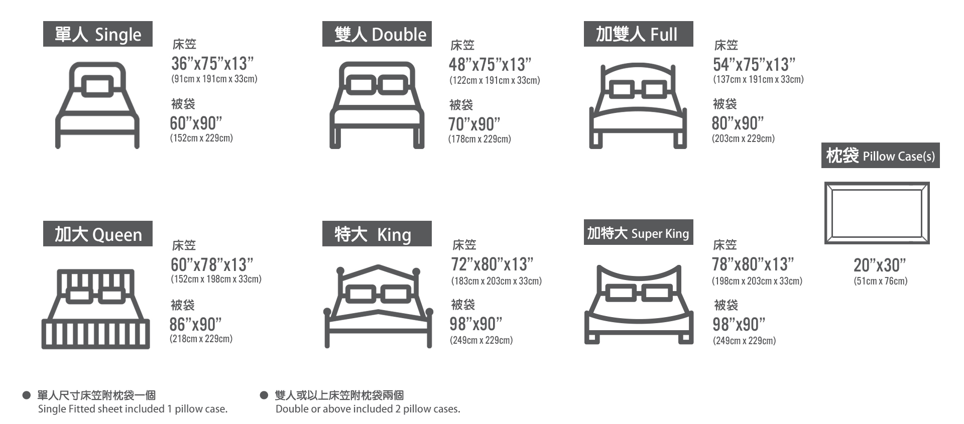 *According to International Industrial Standard Thread Count: Fitted Sheet and Pillow Case(s) 270 (±5%) per inch2, Quilt Cover 310 (±5%) per inch2