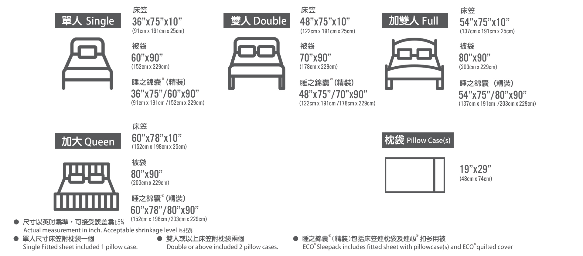One-For-All Sleepack includes fitted sheet with pillow case(s) and ECO® quilted cover. ECO® quilted cover is lined with cotton layer. It can be used as a summer comforter or a quilt cover. In autumn and winter, you can add extra quilt for extra warmth. For ease of changing the cover and layers of quilt, there is ECO® Plus snappers along the quilt cover.