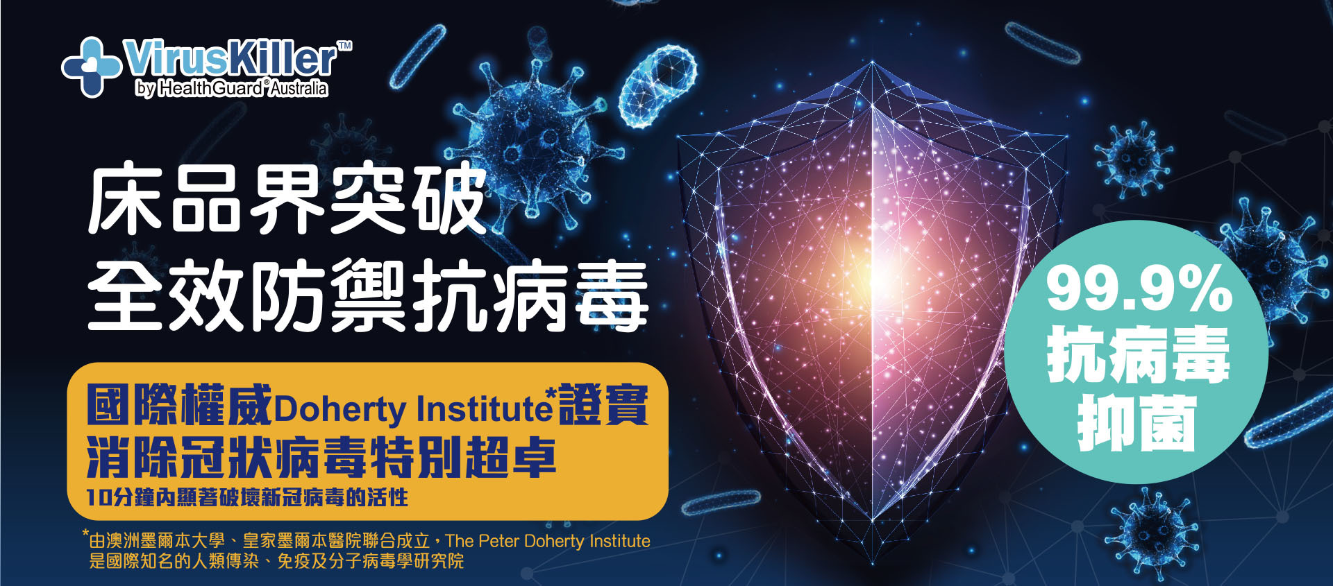 VirusKiller防疫抗病毒系列為你打造潔淨衛生的家居及睡眠環境,告別病毒、細菌、霉菌及異味。VirusKiller採用源自澳洲HealthGuard® AMIC的原料、配方及技術。並經第三方國際權威機構Doherty Institute證實消除冠狀病毒功能超卓。