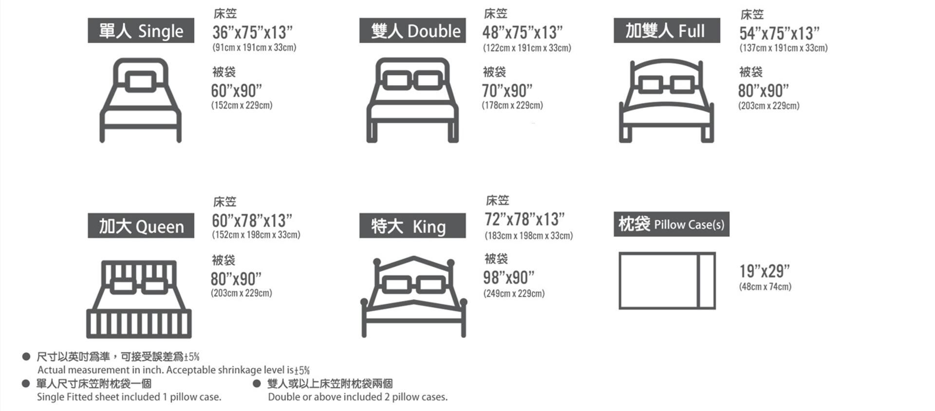 #床笠連枕袋 : 單人尺寸附1個枕袋,其他尺寸附2個枕袋